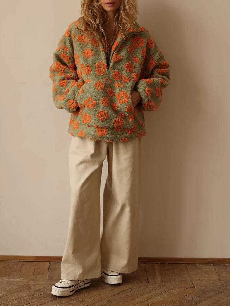 Der lockere, leicht oversized Schnitt sorgt für Bewegungsfreiheit und einen lässigen Look. Der praktische Reißverschluss und der warme Stehkragen geben zusätzlichen Komfort. Das süße Blumenmuster macht die Jacke zu einem echten Hingucker liebevoll, verspielt und trotzdem stilvoll.