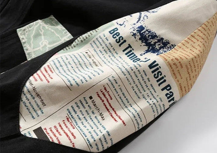Moderne Bomberjacke in Schwarz mit auffälligen Patchwork-Details im Zeitungsdesign. Bequemer Schnitt, hochwertige Verarbeitung und ein echter Blickfang für einen urbanen, trendigen Look